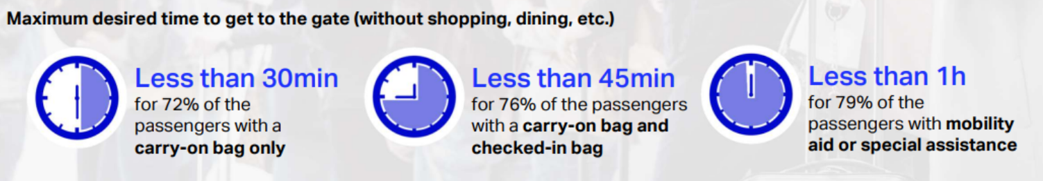 As illustrated in the graph below, passengers across different travel profiles have clear expectations when it comes to how long it should take to reach the departure gate. These expectations set a benchmark for what many now consider a smooth and efficient airport experience.